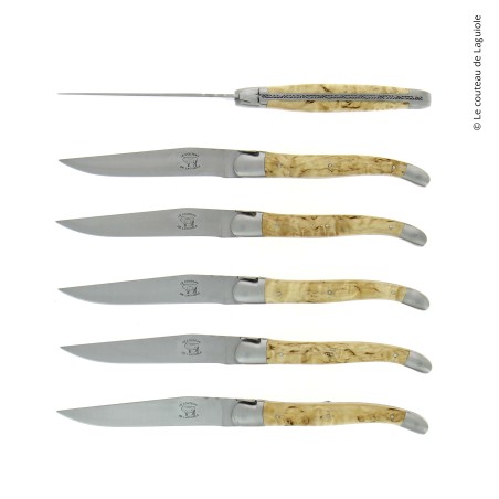 Le Couteau de Laguiole vous propose ce coffret de 6 couteaux de table Laguiole avec un manche en bouleau, et ses mitres inox.