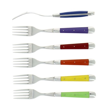Le Couteau de Laguiole vous propose ce coffret de 6 fourchettes de Laguiole avec un manche en tissu coloré multicolore, et ses mitres inox finition brillante.
